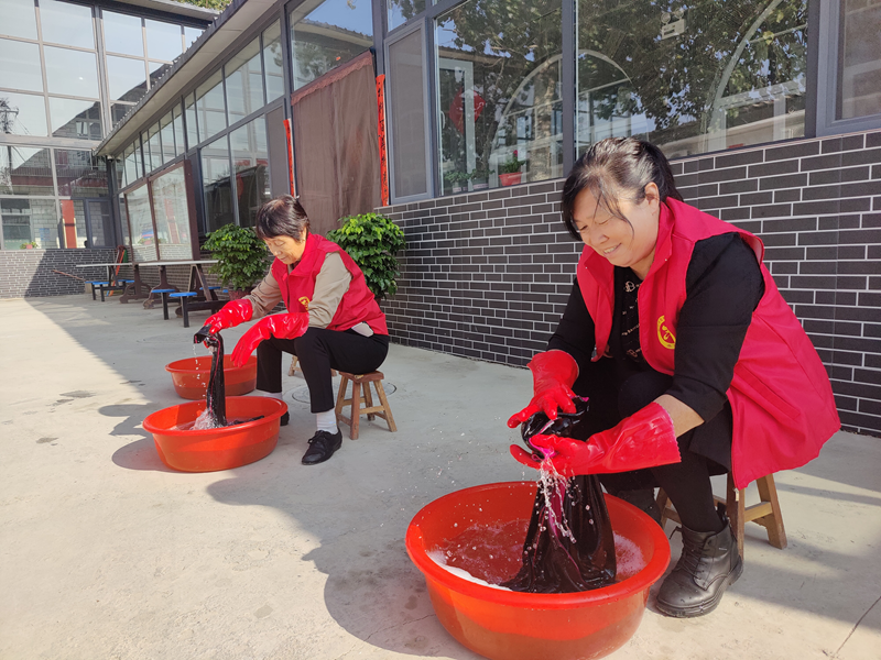 10月14日,石家庄市井陉县上安镇白王庄村新时代文明实践驿站爱心洗衣房志愿者在为老人洗衣。新华网 李然 摄