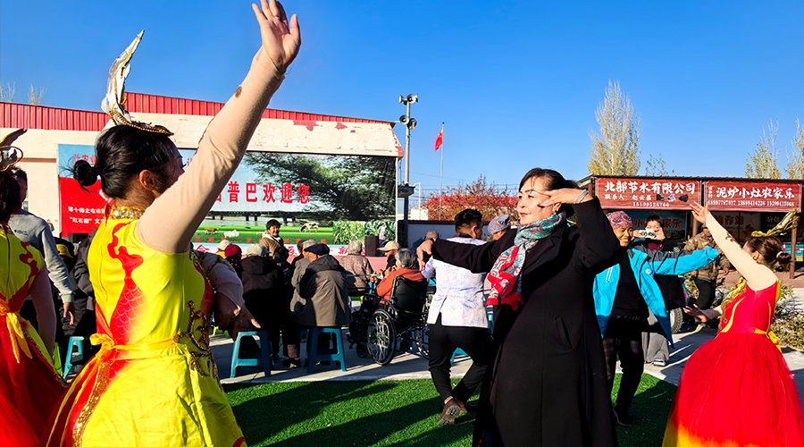 10月22日,阿勒泰市切尔克齐乡阿克恰普巴东村的文化广场上洋溢着火热的氛围。当天,“红石榴”文艺轻骑兵志愿服务队带着精心准备的节目,来到这里与当地舞蹈队联袂演出。悠扬的民族乐器声响起,队员们身着鲜艳的民族服饰,跳起了欢快的黑走马。一个个精彩的节目赢得观众阵阵掌声。演出接近尾声时,队员们走上前,邀请村民们一起跳起麦西来甫,欢快的节奏、灿烂的笑容、紧握的双手,将现场气氛推向高潮。