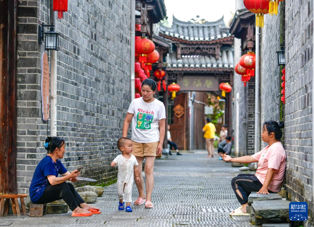 7月15日,贵州省天柱县坌处镇三门塘村的村民在干净整洁的古巷里纳凉。新华社记者 杨文斌 摄