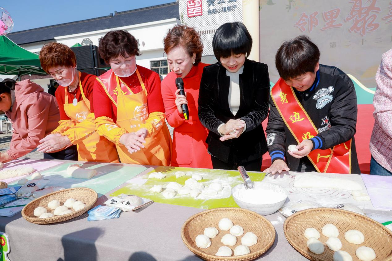 富阳的馒头会“呼吸”,邻里的温情在“发酵”。活动现场,嘉宾们和当地居民一起和面制作富阳特色酒酿馒头,酒酿馒头充分发酵后变得蓬松绵柔,正如一个和谐的社区,因为人与人之间的包容与善意,才显得如此舒展而充满活力。现场大家一起品尝热气腾腾、香甜松软的酒酿馒头,咀嚼的,不仅是富阳地道的风物滋味,更是那份由时光酿就、在邻里间代代相传的人情味儿。